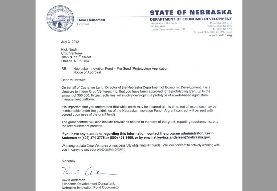 Crop Ventures, an Omaha start-up, was awarded two grants from the Nebraska Department of Economic Development through its innovation initiative of 2012. The funds were used in the prototype development of a web-based agriculture management system. The grants were written and administered by Nick Newlin.